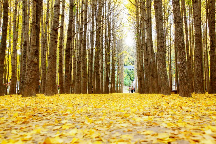 은행나무 숲길을 따라 걷다 보면 바닥에 수북이 쌓인 은행잎이 ‘노란 융단길’을 만들어 주어, 사진 찍기에도 딱 좋다.